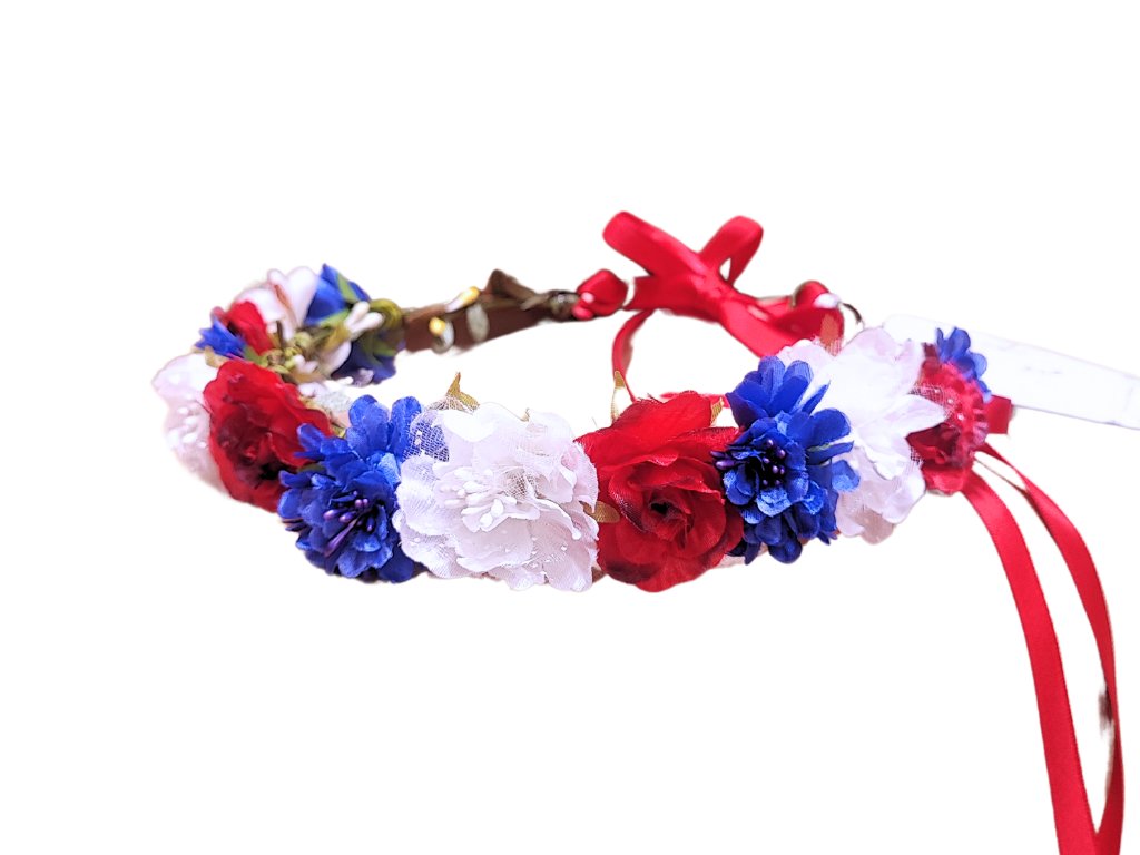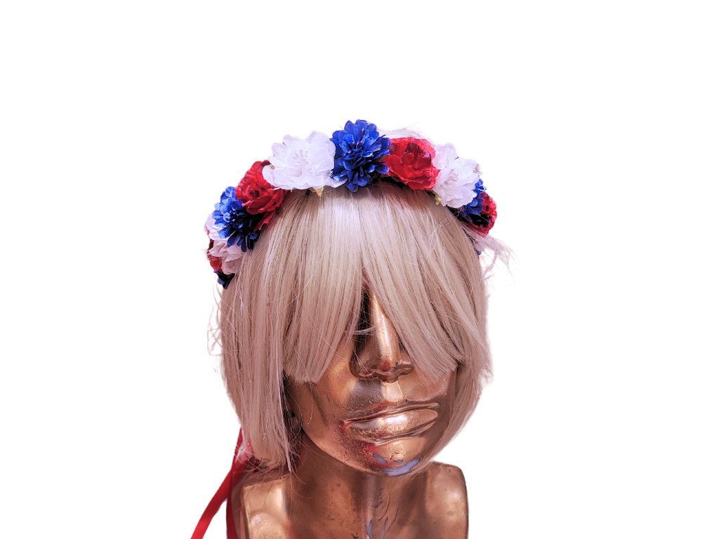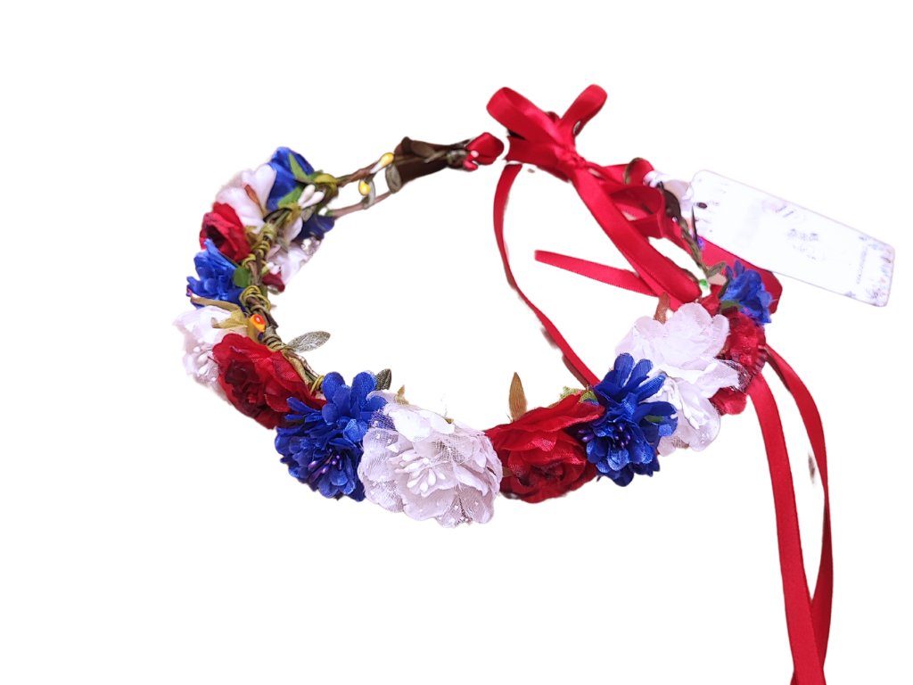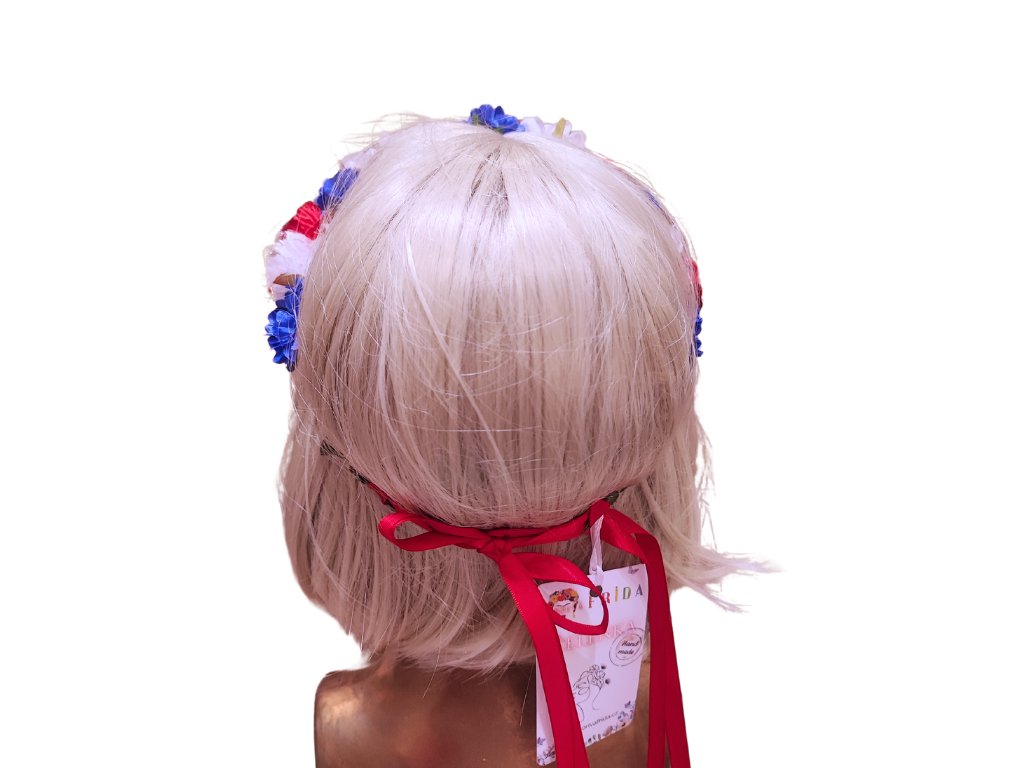 - Má tradiční české barvy, celý věneček je z měkkého drátu obaleného papírovou floristickou stužkou, takže se snadno přizpůsobí tvaru a velikosti hlavy. Můžete ho stočit a omotat kolem drdolu, nebo kolem ruky. A malé holčičky si ho vážou i kolem pasu k šatům.